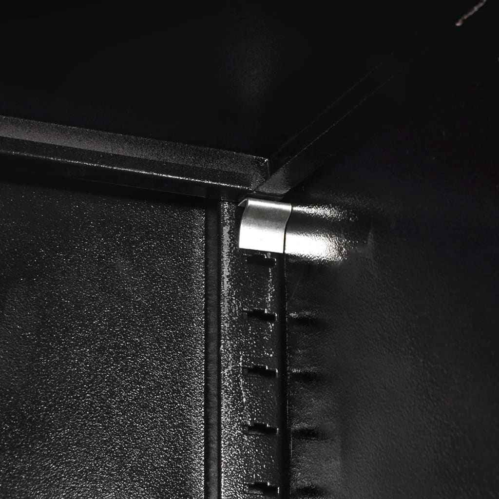 Construit din oțel rezistent, cu un înveliș rezistent la zgârieturi, acest produs este foarte robust și durabil. Sculele dvs. și alte obiecte vor fi păstrate în siguranță datorită unui sistem de blocare în 3 puncte, cu 2 chei potrivite. Acest dulap de scule are 2 rafturi încorporate pentru suspendarea coșurilor de depozitare (neincluse în livrare) și 3 rafturi detașabile cu o capacitate maximă de încărcare de 40 kg fiecare. Placa de fixare din spate poate fi utilizată pentru a agăța tot felul de scule, precum chei fixe, clești, ciocane etc. (sculele și cârligele nu sunt incluse în livrare).