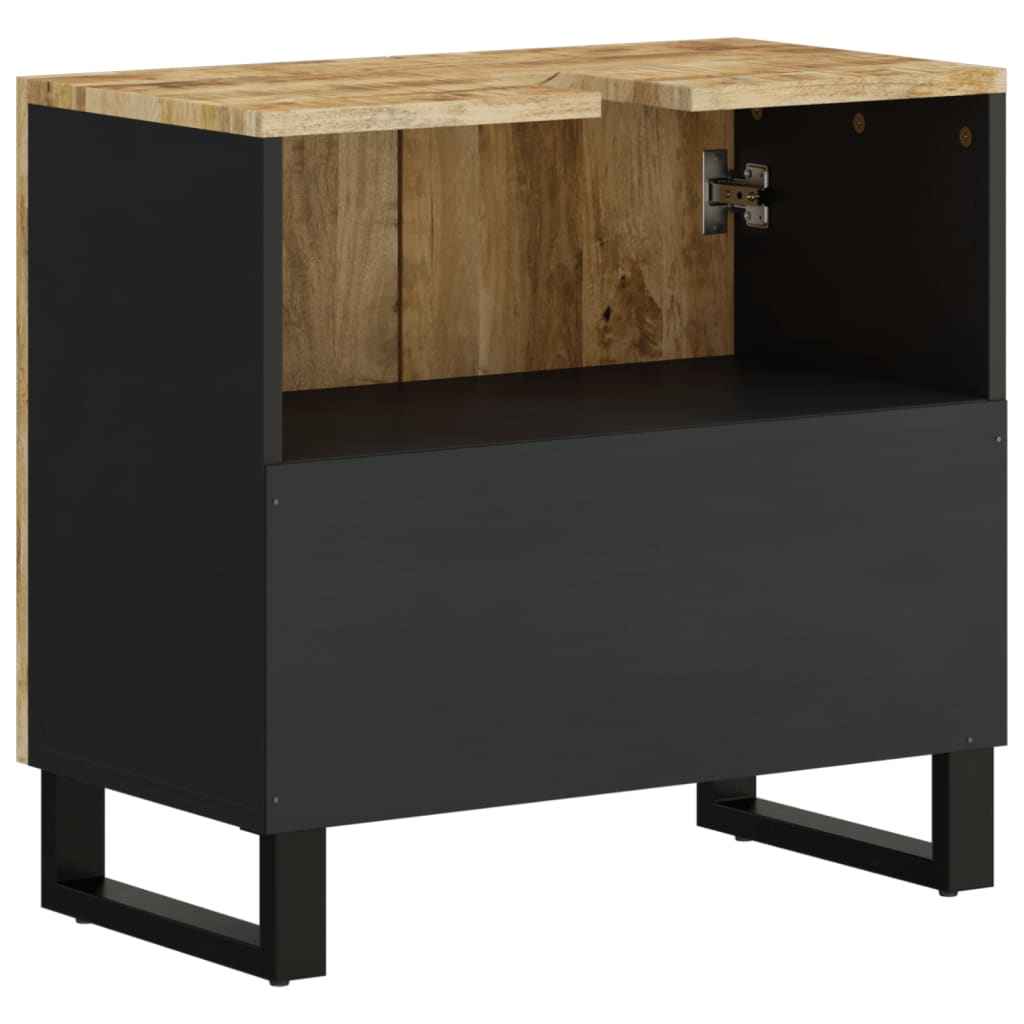 - Lemn masiv de mango: Acest dulap de chiuvetă este realizat din lemn masiv de mango combinat cu lemn compozit. Lemnul masiv de mango este un lemn tropical de esență tare rezistent, din care se produce mobilier robust. Fibrele frumoase ale lemnului fac fiecare piesă de mobilier ușor diferită de celelalte.