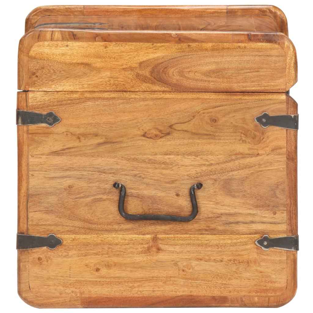 Cufărul este realizat din lemn masiv de acacia, făcându-l stabil și durabil. Are un zăvor în față și două mânere în lateral pentru a putea fi ridicat. Această ladă de depozitare, cu un blat neted, poate fi folosită și ca noptieră. Măiestria execuției și granulația frumoasă a lemnului fac fiecare piesă de mobilier unică și ușor diferită de celelalte.