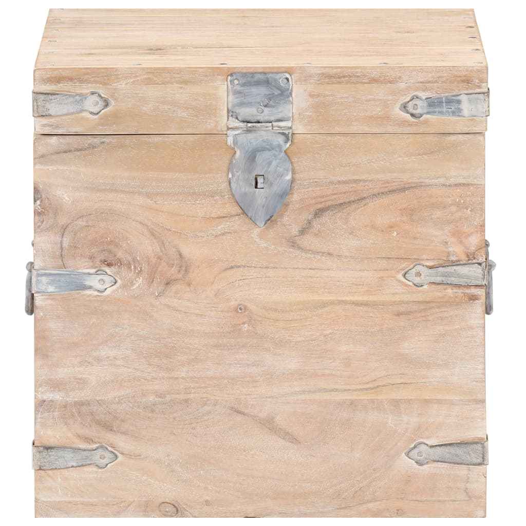 Cufărul este realizat din lemn masiv de acacia, făcându-l stabil și durabil. Are un zăvor în față și două mânere în lateral pentru a putea fi ridicat. Această ladă de depozitare, cu un blat neted, poate fi folosită și ca noptieră. Măiestria execuției și granulația frumoasă a lemnului fac fiecare piesă de mobilier unică și ușor diferită de celelalte.