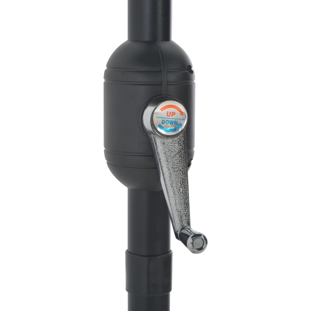 Fabricată din poliester cu protecție UV și anti-decolorare, copertina umbrelei de soare vă oferă o protecție optimă împotriva soarelui și este ușor de curățat. Cu un diametru al tijei de 38 mm, aceasta poate fi montată pe suport sau în mijlocul meselor cu orificii centrale. Designul său în formă de semicerc adaugă un farmec unic umbrelei. Tija rezistentă din aluminiu, împreună cu cele 5 spițe durabile din oțel, oferă stabilitate și durabilitate umbrelei. Umbrela de grădină poate fi deschisă și închisă cu ușurință datorită mecanismului cu manivelă. Produsul este ușor de asamblat.