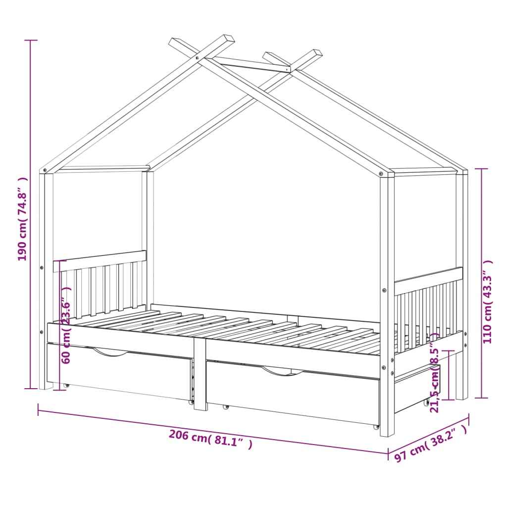 Acest cadru de pat pentru copii, din lemn, cu sertare, este o completare practică și decorativă în orice dormitor.