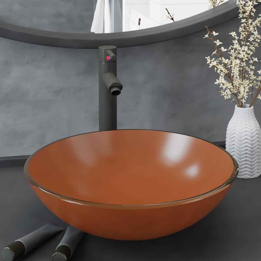 Chiuvetă baie, robinet și scurgere tip push, maro sticlă călită