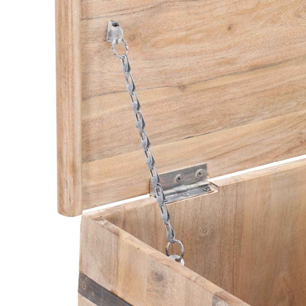 Cufărul este realizat din lemn masiv de acacia, fiind stabil și durabil. Are un zăvor în față și două mânere pe lateral, pentru a putea fi ridicat. Această ladă de depozitare, cu un blat neted și stabil, poate fi folosită și ca banchetă de hol. Măiestria execuției și granulația frumoasă a lemnului fac ca fiecare piesă de mobilier să fie unică și ușor diferită de celelalte.