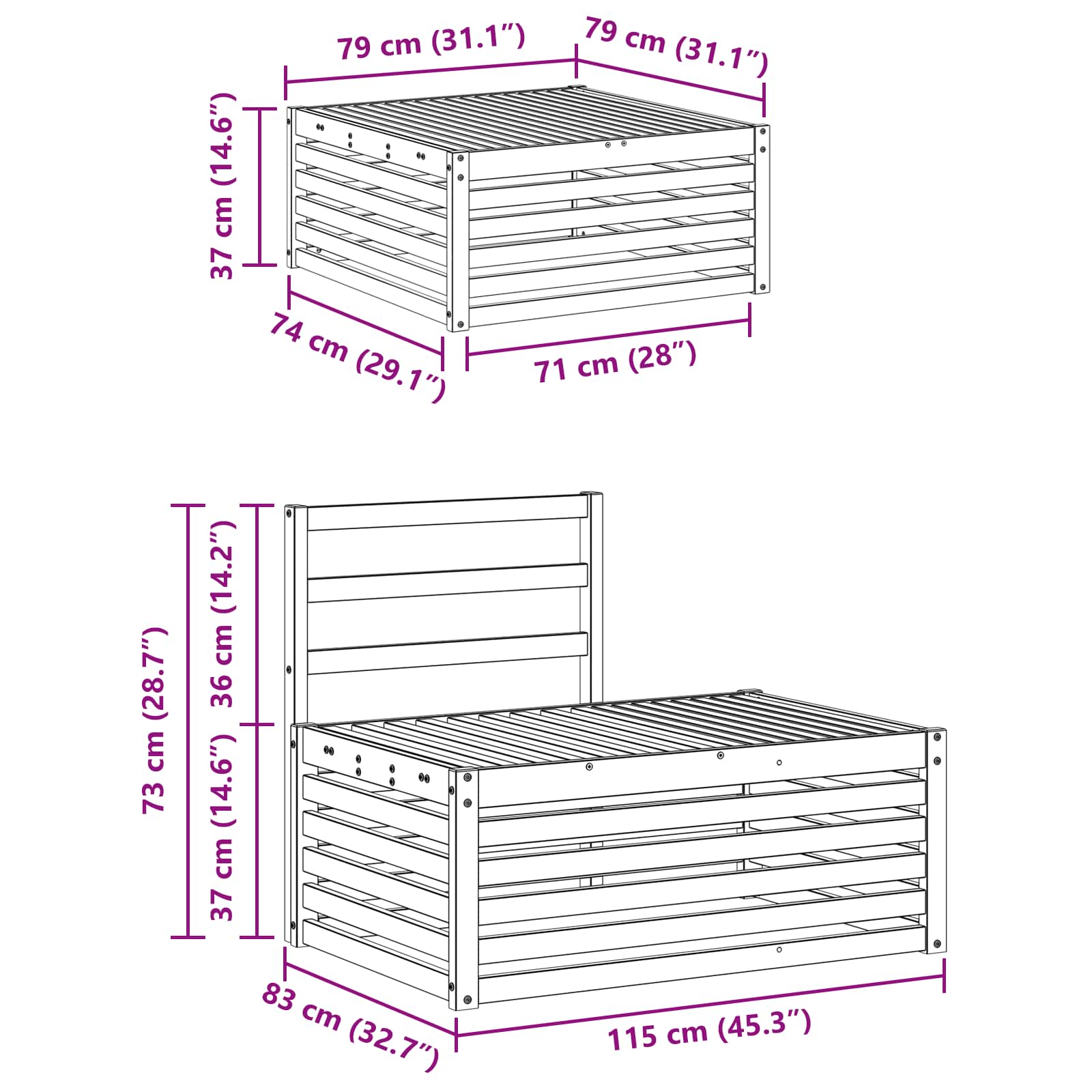 - 2 x Canapea de colț: 115 x 83 x 73 cm (LxWxH)